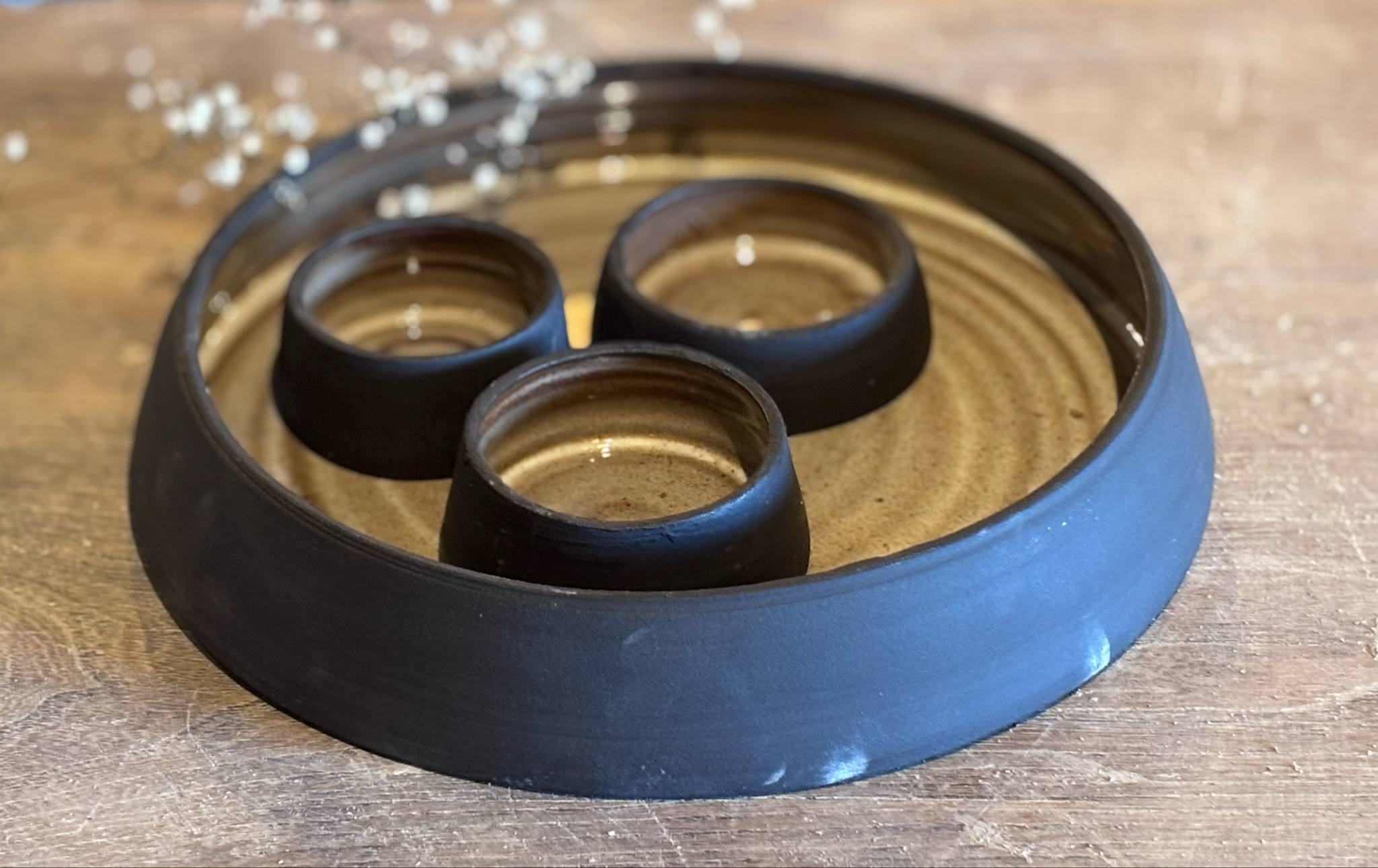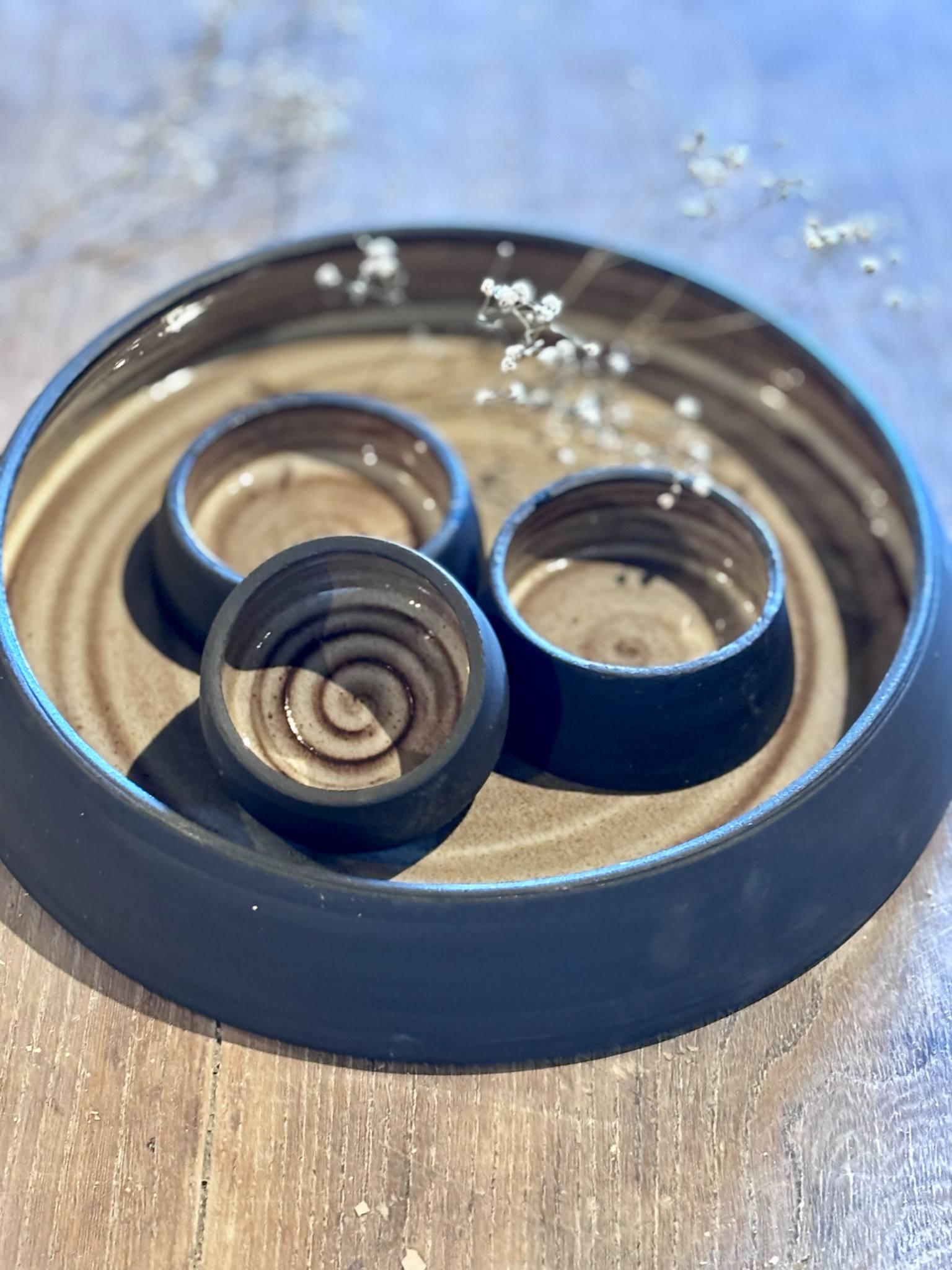 Tapasset in zwarte klei bestaande uit een grote schaal en 3 kleinere potjes.